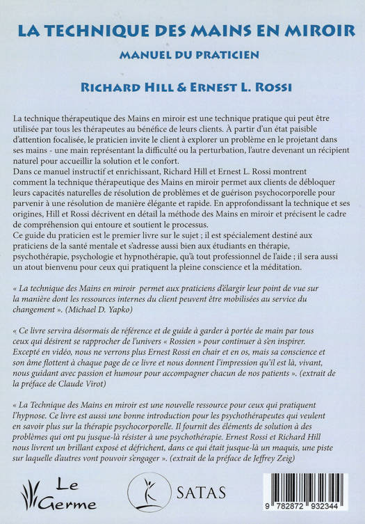 La technique thérapeutique des Mains en miroir est une technique pratique qui peut être utilisée par tous les thérapeutes au bénéfice de leurs clients. A partir d'un état paisible d'attention focalisée, le praticien invite le client à explorer un problème en le projetant dans ses mains - une main représentant la difficulté ou la perturbation, l'autre devenant un récipient naturel pour accueillir la solution et le confort. Dans ce manuel instructif et enrichissant, Richard Hill et Ernest L. Rossi montrent comment la technique thérapeutique des Mains en miroir permet aux clients de débloquer leurs capacités naturelles de résolution de problèmes et de guérison psychocorporelle pour parvenir à une résolution de manière élégante et rapide. En approfondissant la technique et ses origines, Hill et Rossi décrivent en détail la méthode des Mains en miroir et précisent le cadre de compréhension qui entoure et soutient le processus. Ce guide du praticien est le premier livre sur le sujet ; il est spécialement destiné aux praticiens de la santé mentale et s'adresse aussi bien aux étudiants en thérapie, psychothérapie, psychologie et hypnothérapie, qu'à tout professionnel de l'aide ; il sera aussi un atout bienvenu pour ceux qui pratiquent la pleine conscience et la méditation.
