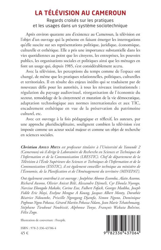 Après environ quarante ans d'existence au Cameroun, la télévision est l'objet d'un ouvrage qui la présente en faisant émerger les interrogations qu'elle suscite sur ses représentations politique, juridique, économique, culturelle et esthétique. Elle a pris une importance substantielle dans les vies quotidiennes au point que les citoyens, les entreprises, les pouvoirs publics, les organisations sociales et politiques ainsi que les ménages en font un usage qui, depuis 1985, s'est considérablement accru. Avec la télévision, les perceptions du temps comme de l'espace ont changé, de même que les pratiques relationnelles, politiques, culturelles et territoriales. Il en résulte des enjeux inédits qui se traduisent par de nouveaux défis pour les autorités, à tous les niveaux institutionnels: régulation du paysage audiovisuel, réorganisation de l'économie du secteur, remodelage de la citoyenneté et mutation de la vie démocratique, adaptation technologique aux normes internationales et aux TIC, encadrement esthétique en vue de la préservation du patrimoine culturel, etc. Avec cet ouvrage à la fois pédagogique et réflexif, les auteurs, par une approche pluridisciplinaire, soulignent combien la télévision s'est imposée comme un acteur social majeur et comme un objet de recherche en sciences sociales.