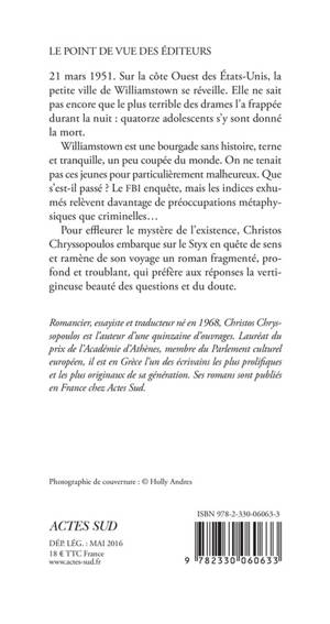 Pour effleurer le mystère de l'existence, Christos Chryssopoulos embarque sur le Styx en quête de sens et ramène de son voyage un roman fragmenté, profond et troublant, qui préfère aux réponses la vertigineuse beauté des questions et du doute.