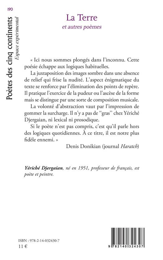 Ici nous sommes plongés dans l'inconnu. Cette poésie échappe aux logiques habituelles. La juxtaposition des images sombre dans une absence de relief qui frise la nudité. L'aspect énigmatique du texte se renforce par l'élimination des points de repère. Il pratique l'exercice de la pudeur ou l'ascèse de la forme mais se distingue par une sorte de composition musicale. La volonté d'abstraction vaut par l'impression de gommer la surcharge. Il n'y a pas de ''gras'' chez Yériché Djergaian, ni lexical ni prosodique. Si le poète n'est pas compris, c'est qu'il parle hors des logiques quotidiennes. À ce titre, il est notre plus fidèle ennemi. Denis Donikian (journal Haratch)