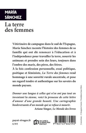 María Sánchez est vétérinaire de campagne, poétesse et activiste. Née en Andalousie, elle raconte la vérité d'un quotidien voué à la terre et à la défense des femmes paysannes qui oeuvrent en silence. A travers ce récit à la fois intime, familial et politique, elle nous invite à concevoir un féminisme qui n'oublie aucun territoire. Mais aussi à retrouver un contact authentique, affectif, avec la nature et tout ce qui, dans le monde rural, donne du sens à la vie ensemble. Véritable phénomène en Espagne, ce livre offre une cartographie bouleversante, délicate et amoureuse d'un monde qui se refuse à mourir.