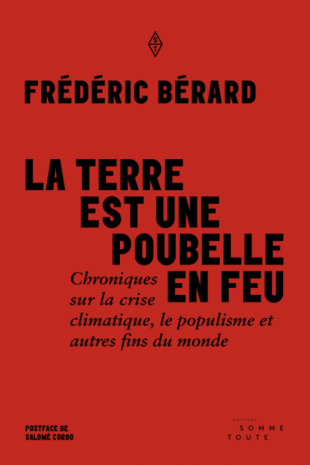 Recueil de chroniques publiées au cours des deux dernières années, La terre est une poubelle en feu se veut un cri d’alarme, une complainte tragique dans laquelle l’accumulation de prophéties dantesques devient un électrochoc contre l’apathie. Frédéric Bérard y jette un regard indigné sur les élites, qu’elle soit politique, économique ou médiatique, et dénonce la passivité qui caractérise notre époque. Si Frédéric Bérard se déclare pessimiste quant à la suite du monde, il refuse d’opter pour la résignation et de taire la duplicité des élus, la violation des droits fondamentaux ou l’aveuglement volontaire face aux enjeux environnementaux.