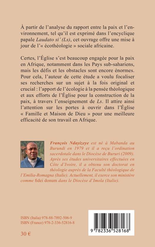 À partir de l'analyse du rapport entre la paix et l'environnement, tel qu'il est exprimé dans l'encyclique papale Laudato si' (Ls), cet ouvrage offre une mise à jour de l' écothéologie sociale africaine. Certes, l'Église s'est beaucoup engagée pour la paix en Afrique, notamment dans les Pays sub-sahariens, mais les défis et les obstacles sont encore énormes. Pour cela, l'auteur de cette étude a voulu focaliser ses recherches sur un sujet à la fois original et crucial: l'apport de l'écologie à la pensée théologique et aux efforts de l'Église pour la construction de la paix, à travers l'enseignement de Ls. Il attire ainsi l'attention sur les portes à ouvrir dans l'Église Famille et Maison de Dieu pour une meilleure efficacité de son travail en Afrique.