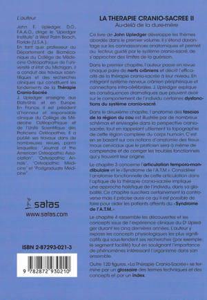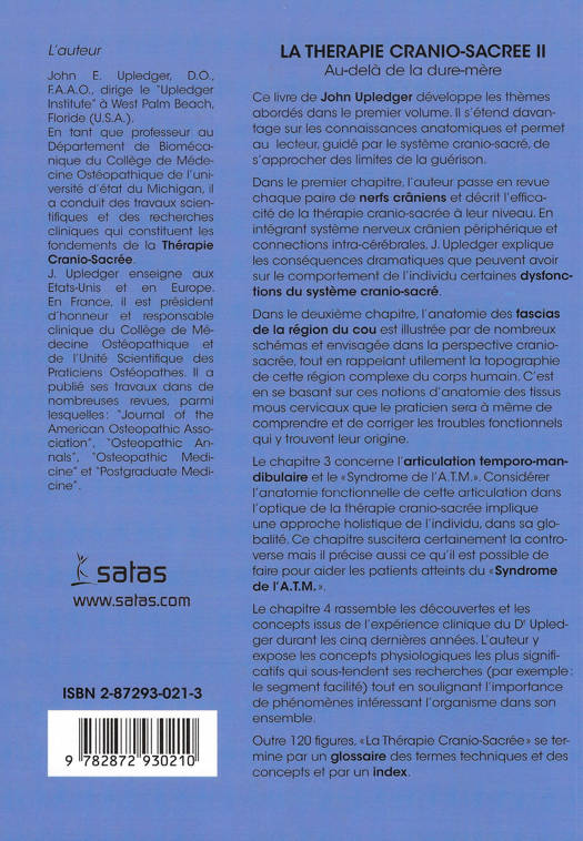 Ce livre de John Upiedger développe les thèmes abordés dans le premier volume. Il s'étend davantage sur les connaissances anatomiques et permet au lecteur, guidé par le système cranio-sacré, de s'approcher des limites de la guérison. Dans le premier chapitre, l'auteur passe en revue chaque paire de nerfs crâniens et décrit l'efficacité de la thérapie cranio-sacrée à leur niveau. En intégrant système nerveux crânien périphérique et connections intra-cérébrales, J. Upledger explique les conséquences dramatiques que peuvent avoir sur le comportement de l'individu certaines dysfonctions du système cranio-sacré. Dans le deuxième chapitre, l'anatomie des fascias de la région du cou est illustrée par de nombreux schémas et envisagée dans la perspective craniosacrée, tout en rappelant utilement la topographie de cette région complexe du corps humain. C'est en se basant sur ces notions d'anatomie des tissus mous cervicaux que le praticien sera à même de comprendre et de corriger les troubles fonctionnels qui y trouvent leur origine. Le chapitre 3 concerne l'articulation temporo-mandibulaire et le «Syndrome de l'A.T.M.». Considérer l'anatomie fonctionnelle de cette articulation dans l'optique de la thérapie cranio-sacrée implique une approche holistique de l'individu, dans sa globalité. Ce chapitre suscitera certainement la controverse mais il précise aussi ce qu'il est possible de faire pour aider les patients atteints du «Syndrome de l'A.T.M. ». Le chapitre 4 rassemble les découvertes et les concepts issus de l'expérience clinique du Dr Upledger durant les cinq dernières années. L'auteur y expose les concepts physiologiques les plus significatifs qui sous-tendent ses recherches (par exemple: le segment facilité) tout en soulignant l'importance de phénomènes intéressant l'organisme dans son ensemble. Outre 120 figures, «La Thérapie Cranio-Sacrée» se termine par un glossaire des termes techniques et des concepts et par un index.