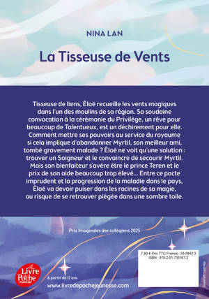Alors qu’elle n’est encore qu’une jeune apprentie Tisseuse de vents, Eloë est convoquée à la cérémonie du Privilège afin de mettre ses pouvoirs au service du royaume d’Yria. Un rêve pour beaucoup de Talentueux, mais un déchirement pour elle qui souhaite rester auprès de Myrtil, son meilleur ami tombé gravement malade. Désespérée, elle conclut un marché avec un Soigneur, aussi irritant que charmant, dans l’espoir de sauver son ami… Un pacte qu’elle regrette aussitôt, car la maladie semble incurable et se répand dans tout le royaume. Eloë va devoir aller puiser dans les racines obscures de sa magie, pour tenter de dénouer les liens de ce mystère… au risque de se retrouver prise au piège d’une bien plus sombre toile.