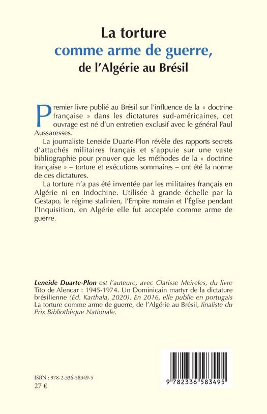 Premier livre publié au Brésil sur l'influence de la doctrine française dans les dictatures sud-américaines, cet ouvrage est né d'un entretien exclusif avec le général Paul Aussaresses. La journaliste Leneide Duarte-Plon révèle des rapports secrets d'attachés militaires français et s'appuie sur une vaste bibliographie pour prouver que les méthodes de la doctrine française - torture et exécutions sommaires - ont été la norme de ces dictatures. La torture n'a pas été inventée par les militaires français en Algérie ni en Indochine. Utilisée à grande échelle par la Gestapo, le régime stalinien, l'Empire romain et l'Église pendant l'Inquisition, en Algérie elle fut acceptée comme arme de guerre.