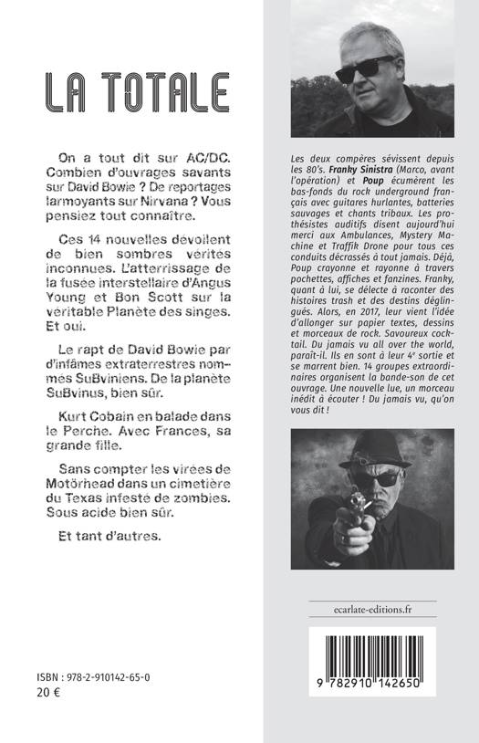 On a tout dit sur AC/DC. Combien d'ouvrages savants sur David Bowie ? De reportages larmoyants sur Nirvana ? Vous pensiez tout connaître. Ces 14 nouvelles dévoilent de bien sombres vérités inconnues. L'atterrissage de la fusée interstellaire d'Angus Young et Bon Scott sur la véritable Planète des singes. Et oui. Le rapt de David Bowie par d'infâmes extraterrestres nommés SuBviniens. De la planète SuBvinus, bien sûr. Kurt Cobain en balade dans le Perche. Avec Frances, sa grande fille. Sans compter les virées de Motörhead dans un cimetière du Texas infesté de zombies. Sous acide bien sûr. Et tant d'autres.