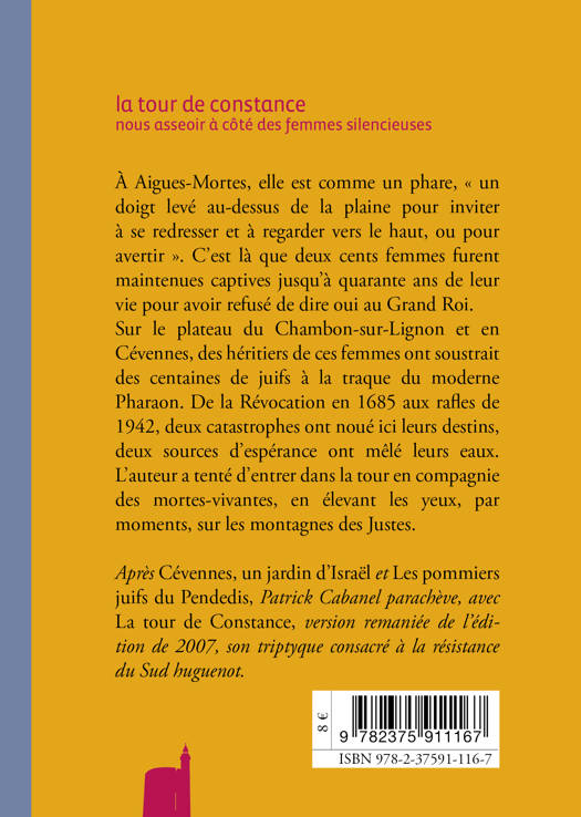 À Aigues-Mortes, elle est comme un phare, « un doigt levé au-dessus de la plaine pour inviter à se redresser et à regarder vers le haut, ou pour avertir ». C’est là que deux cents femmes furent maintenues captives jusqu’à quarante ans de leur vie pour avoir refusé de dire oui au Grand Roi. Sur le plateau du Chambon-sur-Lignon et en Cévennes, des héritiers de ces femmes ont soustrait des centaines de juifs à la traque du moderne Pharaon. De la Révocation en 1685 aux rafles de 1942, deux catastrophes ont noué ici leurs destins, deux sources d’espérance ont mêlé leurs eaux. L’auteur a tenté d’entrer dans la tour en compagnie des mortes-vivantes, en élevant les yeux, par moments, sur les montagnes des Justes.