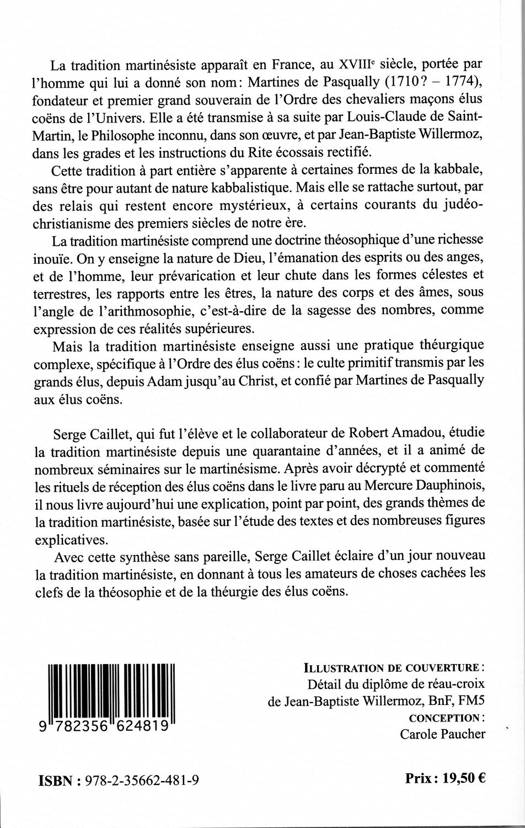 La Tradition martinésiste apparaît en France, au XVIIIe siècle, portée par l’homme qui lui a donné son nom : Martines de Pasqually (1710 – 1774), fondateur et premier grand souverain de l’Ordre des chevaliers maçons élus coëns de l’Univers. Elle a été transmise à sa suite par Louis-Claude de Saint-Martin, le Philosophe inconnu, dans son œuvre, et par Jean-Baptiste Willermoz, dans les grades et les instructions du Rite écossais rectifié. Cette tradition à part entière s’apparente à certaines formes de la kabbale, sans être pour autant de nature kabbalistique. Mais elle se rattache surtout, par des relais qui restent encore mystérieux, à certains courants du judéo-christianisme des premiers siècles de notre ère. La Tradition martinésiste comprend une doctrine théosophique d’une richesse inouïe. On y enseigne la nature de Dieu, l’émanation des esprits ou des anges, et de l’homme, leur prévarication et leur chute dans les formes célestes et terrestres, les rapports entre les êtres, la nature des corps et des âmes, sous l’angle de l’arithmosophie, c’est-à-dire de la sagesse des nombres, comme expression de ces réalités supérieures. Mais la Tradition martinésiste enseigne aussi une pratique théurgique complexe, spécifique à l’Ordre des élus coëns : le culte primitif transmis par les grands élus, depuis Adam jusqu’au Christ, et confié par Martines de Pasqually aux élus coëns. Après avoir décrypté et commenté les rituels de réception des élus coëns (« Les Sept sceaux des élus coëns », Le Mercure Dauphinois, 2011), Serge Caillet nous livre aujourd’hui une explication, point par point, des grands thèmes de la Tradition martinésiste, basée sur l’étude des textes et de nombreuses figures explicatives du XVIIIe siècle. Avec cette synthèse sans pareille, Serge Caillet éclaire d’un jour nouveau la Tradition martinésiste, en donnant à tous les amateurs de choses cachées les clefs de la théosophie et de la théurgie des élus coëns.