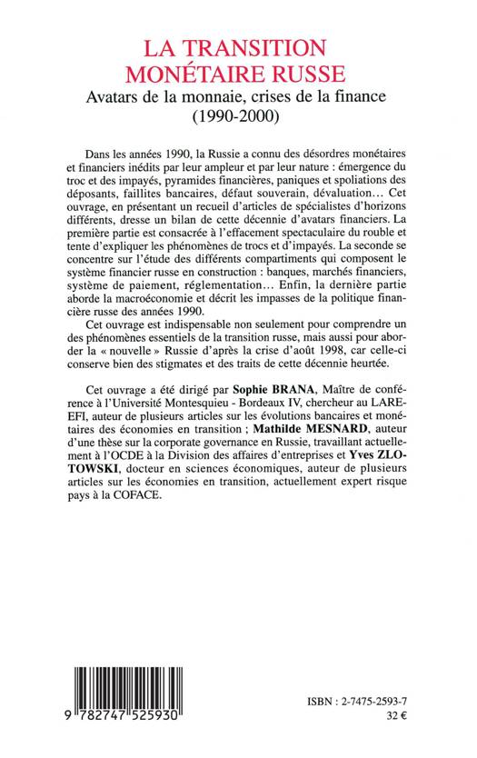 Dans les années 1990, la Russie a connu des désordres monétaires et financiers inédits : émergence du troc et des impayés, pyramide financière, paniques et spoliations des déposants, faillites bancaires, dévaluation La première partie du bilan de cette décennie est consacrée à l'effacement spectaculaire du rouble et tente d'expliquer les phénomènes de troc et d'impayés. La seconde se concentre sur l'étude du système financier russe. La troisième partie aborde la macroéconomie et décrit les impasses de la politique financière des années 1990.