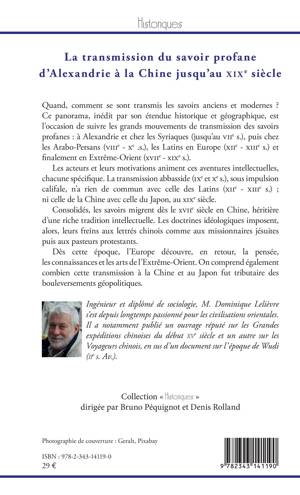 Quand, comment se sont transmis les savoirs anciens et modernes ? Ce panorama est l'occasion de suivre les grands mouvements de transmission des savoirs profanes, notamment chez les Syriaques, les Arabo-Persans, les Latins et en Extrême-Orient. La migration des connaissances et des arts et leur découverte réciproque par les civilisations ont été tributaires des bouleversements géopolitiques.
