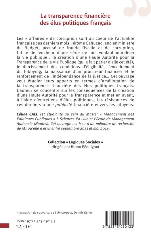 Cet ouvrage veut étudier les apports des lois et dispositifs mis en uvre pour lutter contre la corruption depuis l'affaire Cahuzac, avec notamment la mise en place d'une haute Autorité pour la Transparence de la Vie Publique, le durcissement des conditions d'éligibilité, l'encadrement du lobbying, la naissance d'un procureur financier,... L'auteur analyse les conséquences de ces mesures et rend compte à l'aide d'entretiens d'élus politiques, des résistances de ces derniers à une publicité financière envers les citoyens.