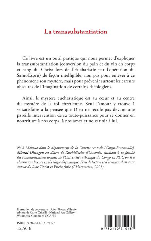 Ce livre est un outil pratique qui nous permet d'expliquer la transsubstantiation (conversion du pain et du vin en corps et sang du Christ lors de l'Eucharistie par l'opération du Saint-Esprit) de façon intelligible, non pas pour enlever à ce phénomène son mystère, mais pour prévenir surtout les erreurs obscures de l'imagination de certains théologiens. Ainsi, le mystère eucharistique est au coeur et au centre du mystère de la foi chrétienne. Seul l'amour y trouve à se satisfaire à la pensée que Dieu ne recule pas devant une pareille intervention de sa toute-puissance pour se donner en nourriture à nos corps, à nos âmes et nous unir à lui.