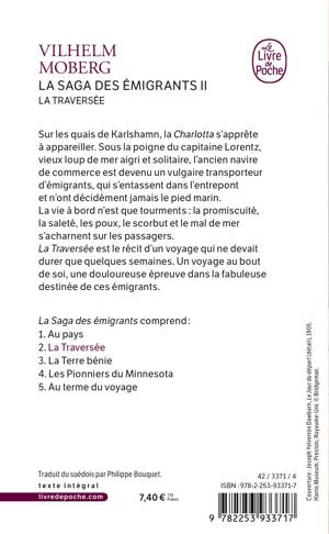 Il fut un temps où la Charlotta était un noble navire de commerce et non un vulgaire transporteur d'émigrants, cette engeance qui s'entasse dans l'entrepont et n'a décidément jamais le pied marin. La vie à bord n'est que tourments : la promiscuité, la saleté, les poux, le scorbut et le mal de mer s'acharnent sur les passagers. Le capitaine Lorentz, vieux loup de mer aigri et solitaire, le sait bien, lui qui prévoit un boisseau de terre de Suède en vue de simuler des funérailles qui se termineront inéluctablement au fond de l'eau. Après Au pays, La Traversée est le récit d'un voyage qui ne devait durer que quelques semaines. Un voyage au bout de soi, une douloureuse épreuve dans la fabuleuse destinée de ces émigrants.