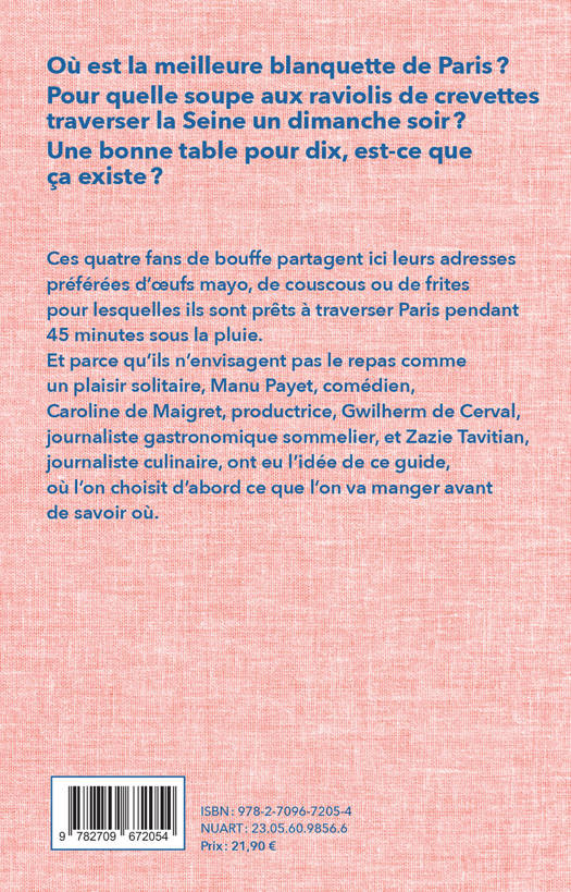Et parce qu’ils n’envisagent pas le repas comme un plaisir solitaire, Manu Payet, comédien, Caroline de Maigret, productrice, Gwilherm de Cerval, journaliste gastronomique sommelier, et Zazie Tavitian, journaliste culinaire, ont eu l’idée de ce guide, où l’on choisit d’abord ce que l’on va manger avant de savoir où.