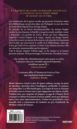 En présence de ces forces incommensurables, les notions fragiles comme le coeur humain, la famille et jusqu'au monde semblent vouées à disparaître. Les proches de Livira, divisés par leurs allégeances, dispersés à travers l'espace et le temps, courent un danger mortel. Livira doit trouver un moyen de les réunir et de résoudre les dissensions inextricables qui nourrissent le conflit de la Bibliothèque, alors que le lien qui l'unit à Evar continue à s'étirer. Leur relation survivra-t-elle aux obstacles insurmontables qui les séparent ?