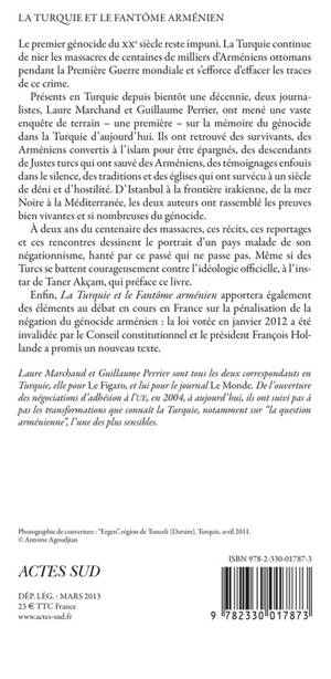 Présents en Turquie depuis bientôt une décennie, deux journalistes, Laure Marchand et Guillaume Perrier, ont mené une vaste enquête de terrain - une première - sur la mémoire du génocide dans la Turquie d'aujourd'hui. Ils ont retrouvé des survivants, des Arméniens convertis à l'islam pour être épargnés, des descendants de Justes turcs qui ont sauvé des Arméniens, des témoignages enfouis dans le silence, des traditions et des églises qui ont survécu à un siècle de déni et d'hostilité. D'Istanbul à la frontière irakienne, de la mer Noire à la Méditerranée, les deux auteurs ont rassemblé les preuves bien vivantes et si nombreuses du génocide.