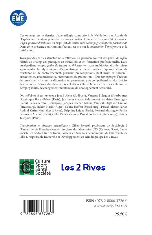 Cet ouvrage est le dernier d'une trilogie consacrée à la Validation des Acquis de l'Expérience. Les deux précédents volumes portaient d'une part sur un état des lieux et les perspectives d'évolution du dispositif, de l'autre sur l'accompagnement et le partenariat. Dans cette présente contribution, l'accent est mis sur la motivation, l'engagement et la satisfaction.
