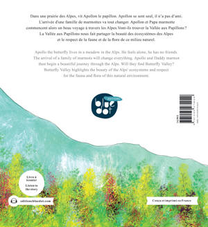 Dans une prairie des Alpes, Apollon le papillon se sent seul car il n'a pas d'ami. Heureusement, l'arrivée d'une famille de marmottes va tout changer. Apollon et Papa marmotte commencent alors un beau voyage à travers les Alpes pour trouver la Vallée aux Papillons. Ce livre bilingue nous fait partager la beauté des ecosystèmes des Alpes et le respect de la faune et de la flore de ce milieu naturel exceptionnel.