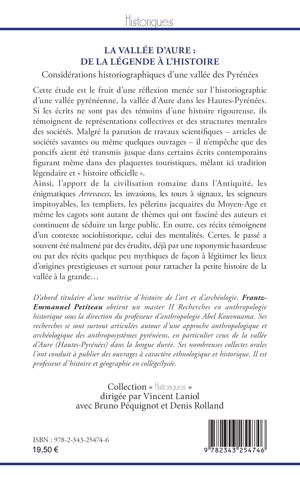 Cette étude est le fruit d’une réflexion menée sur l’historiographie d’une vallée pyrénéenne, la vallée d’Aure dans les Hautes-Pyrénées. Si les écrits ne sont pas des témoins d’une histoire rigoureuse, ils témoignent de représentations collectives et des structures mentales des sociétés. L’apport de la civilisation romaine dans l’Antiquité, les énigmatiques Arrevasces, les invasions, les tours à signaux, les seigneurs impitoyables, les templiers, les pèlerins jacquaires du Moyen-Age et même les cagots sont autant de thèmes qui ont fasciné des auteurs et continuent de séduire un large public.
