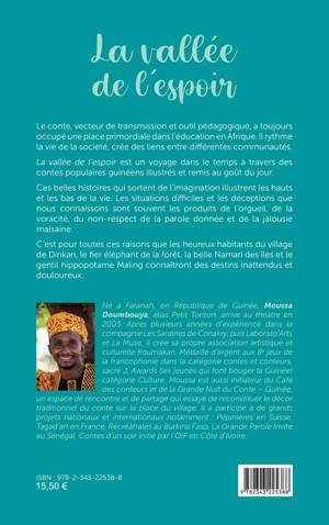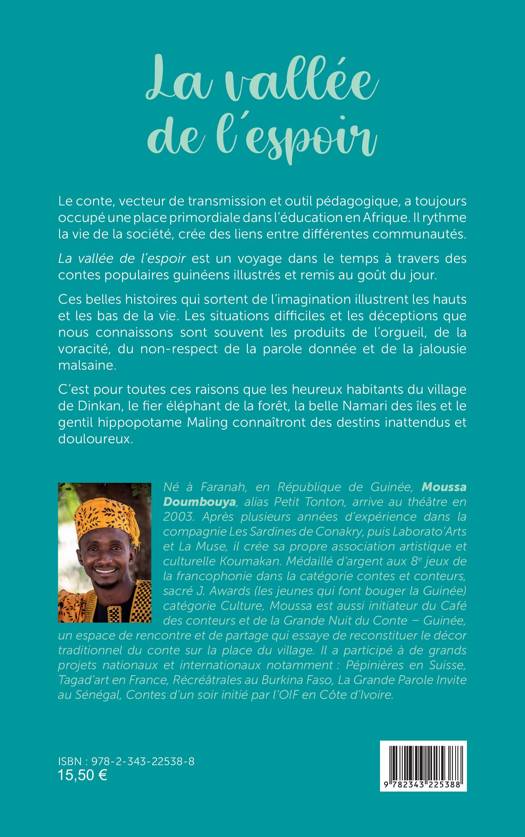 Le conte, vecteur de transmission et outil pédagogique, a toujours occupé une place primordiale dans l’éducation en Afrique. Il rythme la vie de la société, crée des liens entre différentes communautés. La vallée de l’espoir est un voyage dans le temps à travers des contes populaires guinéens illustrés et remis au goût du jour. Les situations difficiles et les déceptions que nous connaissons sont souvent les produits de l’orgueil, de la voracité, du non-respect de la parole donnée et de la jalousie malsaine. C’est pour toutes ces raisons que les heureux habitants du village de Dinkan, le fier éléphant de la forêt, la belle Namari des îles et le gentil hippopotame Maling connaîtront des destins inattendus et douloureux.