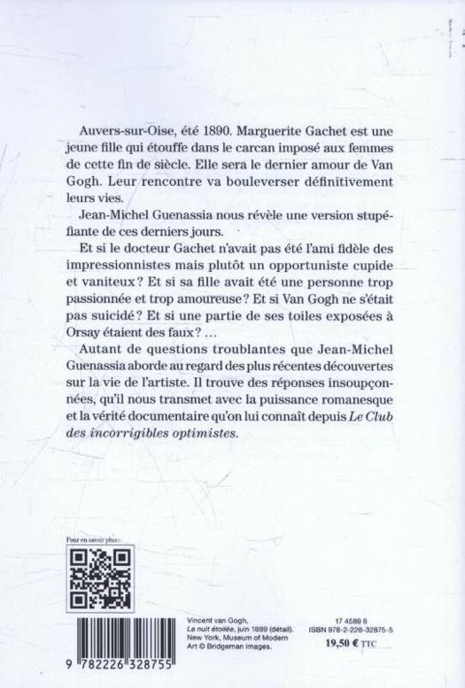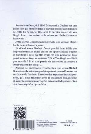 Auvers-sur-Oise, été 1890. Marguerite Gachet est une jeune fille qui étouffe dans le carcan imposé aux femmes de cette fin de siècle. Elle sera le dernier amour de Van Gogh. Leur rencontre va bouleverser définitivement leurs vies. Jean-Michel Guenassia nous révèle une version stupéfiante de ces derniers jours. Et si le docteur Gachet n'avait pas été l'ami fidèle des impressionnistes mais plutôt un opportuniste cupide et vaniteux ? Et si sa fille avait été une personne trop passionnée et trop amoureuse ? Et si Van Gogh ne s'était pas suicidé ? Et si une partie de ses toiles exposées à Orsay étaient des faux ?... Autant de questions passionnantes que Jean-Michel Guenassia aborde au regard des plus récentes découvertes sur la vie de l'artiste. Il trouve des réponses insoupçonnées, qu'il nous transmet avec la puissance romanesque et la vérité documentaire qu'on lui connaît depuis Le Club des incorrigibles optimistes.