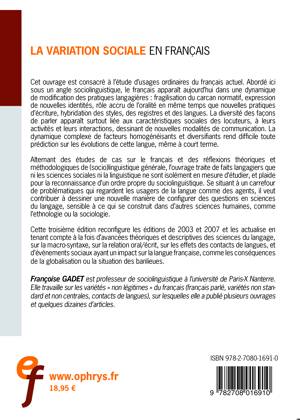 Cet ouvrage est consacré à l’étude d’usages ordinaires du français actuel. Abordé ici sous un angle sociolinguistique, le français apparaît aujourd’hui dans une dynamique de modification des pratiques langagières : fragilisation du carcan normatif, expression de nouvelles identités, rôle accru de l’oralité en même temps que nouvelles pratiques d’écriture, hybridation des styles, des registres et des langues. La diversité des façons de parler apparaît surtout liée aux caractéristiques sociales des locuteurs, à leurs activités et leurs interactions, dessinant de nouvelles modalités de communication. La dynamique complexe de facteurs homogénéisants et diversifiants rend difficile toute prédiction sur les évolutions de cette langue, même à court terme. Alternant des études de cas sur le français et des réflexions théoriques et méthodologiques de (socio)linguistique générale, l’ouvrage traite de faits langagiers que ni les sciences sociales ni la linguistique ne sont isolément en mesure d’étudier, et plaide pour la reconnaissance d’un ordre propre du sociolinguistique. Se situant à un carrefour de problématiques qui regardent les usagers de la langue comme des agents, il veut contribuer à dessiner une nouvelle manière de configurer des questions en sciences du langage, sensible à ce qui se construit dans d’autres sciences humaines, comme l’ethnologie ou la sociologie. Cette troisième édition reconfigure les éditions de 2003 et 2007 et les actualise en tenant compte à la fois d’avancées théoriques et descriptives des sciences du langage, sur la macro-syntaxe, sur la relation oral/écrit, sur les effets des contacts de langues, et d’événements sociaux ayant un impact sur la langue française, comme les conséquences de la globalisation ou la situation des banlieues.