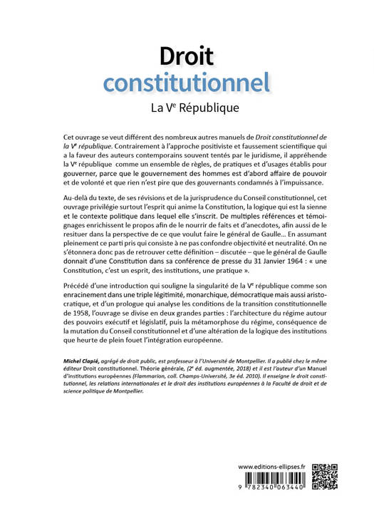 Cet ouvrage se veut différent des nombreux autres manuels de Droit constitutionnel de la Ve république. Contrairement à l’approche positiviste et faussement scientifique qui a la faveur des auteurs contemporains souvent tentés par le juridisme, il appréhende la Ve république comme un ensemble de règles, de pratiques et d’usages établis pour gouverner, parce que le gouvernement des hommes est d’abord affaire de pouvoir et de volonté et que rien n’est pire que des gouvernants condamnés à l’impuissance.