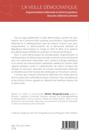 Cet ouvrage problématise la veille démocratique, partant de deux ressorts de la communication politique journalistique, l’argumentation éditoriale et la stéréotypisation dans les editorial cartoons, avec pour soubassements, la déconsolidation de la démocratie politique en République démocratique du Congo en 2015 et 2016, et la vigilance pro-démocratique effrénée du quotidien Le Potentiel de Kinshasa. D’où, la veille démocratique est conceptualisée. L’argumentation, la stéréotypisation et l’éditorial sont revisités. L’editorial cartoon est discerné dans son authenticité irréductible. Ainsi, autant le cadrage médiatique et le contrat de communication médiatique mettent en lumière cette vigilance politique, autant la systématisation de celle-ci transpire des résultats et discussion découlant de l’analyse argumentative éditoriale sur 42 éditoriaux et de l’analyse des stéréotypes sur 42 editorial cartoons. Il s’ensuit que l’instance énonciatrice éditoriale d’un média peut en faire un acteur de la veille démocratique ; et lorsqu’il l’est, ses éditoriaux et ses editorial cartoons agissent en dispositifs de médiation vecteurs de la même veille.