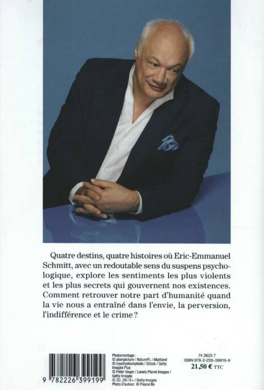 Quatre destins, quatre histoires où Eric-Emmanuel Schmitt, avec un redoutable sens du suspens psychologique, explore les sentiments les plus violents et les plus secrets qui gouvernent nos existences. Comment retrouver sa part d'humanité quand la vie vous a entraîné dans l'envie, la perversion, l'indifférence, le crime ?