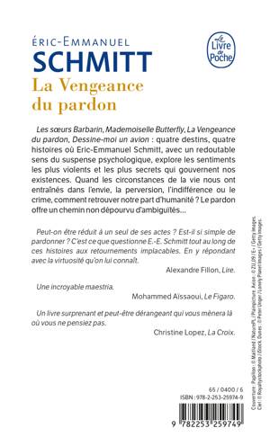Les sœurs Barbarin , Mademoiselle Butterfly , La vengeance du pardon , Dessine-moi un avion : Quatre destins, quatre histoires où Éric-Emmanuel Schmitt, avec un redoutable sens du suspense psychologique, explore les sentiments les plus violents et les plus secrets qui gouvernent nos existences. Quand les circonstances de la vie nous ont entraînés dans l'envie, la perversion, l'indifférence ou le crime, comment retrouver notre part d’humanité ? Le pardon offre un chemin non dépourvu d’ambiguïtés…
