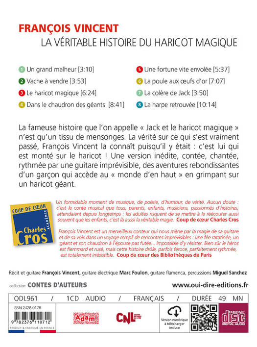 La fameuse histoire que l’on appelle « Jack et le haricot magique » n’est qu’un tissu de mensonges. La vérité sur ce qui s’est vraiment passé, je la connais puisque j’y étais : c’est moi qui suis monté sur le haricot ! Une version inédite, contée, chantée, rythmée par une guitare imprévisible, des aventures rebondissantes d’un garçon qui accède au « monde d’en haut » en grimpant sur un haricot géant.