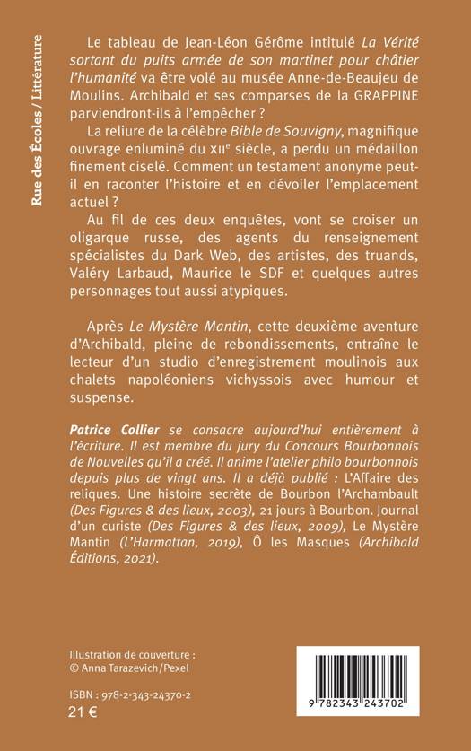 Le tableau de Jean-Léon Gérôme intitulé La Vérité sortant du puits armée de son martinet pour châtier l’humanité va être volé au musée Anne-de-Beaujeu de Moulins. Archibald et ses comparses de la GRAPPINE parviendront-ils à l’empêcher ? La reliure de la célèbre Bible de Souvigny, magnifique ouvrage enluminé du XIIe siècle, a perdu un médaillon finement ciselé. Comment un testament anonyme peut-il en raconter l’histoire et en dévoiler l’emplacement actuel ? Au fil de ces deux enquêtes, vont se croiser un oligarque russe, des agents du renseignement spécialistes du Dark Web, des artistes, des truands, Valéry Larbaud, Maurice le SDF et quelques autres personnages tout aussi atypiques. Après Le Mystère Mantin, cette deuxième aventure d’Archibald, pleine de rebondissements, entraîne le lecteur d’un studio d’enregistrement moulinois aux chalets napoléoniens vichyssois avec humour et suspense.