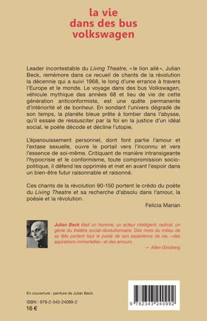 Leader incontestable du Living Theatre, « le lion ailé », Julian Beck, remémore dans ce recueil de chants de la révolution la décennie qui a suivi 1968, le long d’une errance à travers l’Europe et le monde. Le voyage dans des bus Volkswagen, véhicule mythique des années 68 et lieu de vie de cette génération anticonformiste, est une quête permanente d’intériorité et de bonheur. En sondant l’univers dégradé de son temps, la planète bleue prête à tomber dans l’abysse, qu’il essaie de ressusciter par la foi en la justice d’un idéal social, le poète décode et décline l’utopie [...]. Ces chants de la révolution 90-150 portent le crédo du poète du Living Theatre et sa recherche d’absolu dans l’amour, la poésie et la révolution. - Felicia Marian