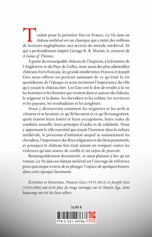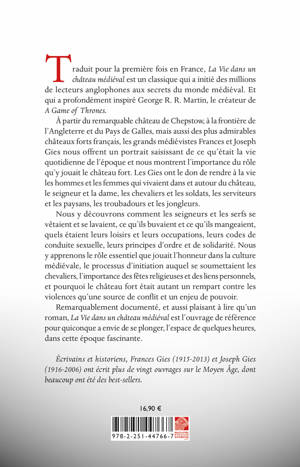 Traduit pour la premiere fois en France, La Vie dans un chateau medieval est un classique qui a initie des millions de lecteurs anglophones aux secrets du monde medieval. Et qui a profondement inspire George R. R. Martin, le createur de A Game of Thrones. A partir du remarquable chateau de Chepstow, a la frontiere de l'Angleterre et du Pays de Galles, mais aussi des plus admirables chateaux forts francais, les grands medievistes Frances et Joseph Gies nous offrent un portrait saisissant de ce qu'etait la vie quotidienne de l'epoque et nous montrent l'importance du role qu'y jouait le chateau fort. Les Gies ont le don de rendre a la vie les hommes et les femmes qui vivaient dans et autour du chateau, le seigneur et la dame, les chevaliers et les soldats, les serviteurs et les paysans, les troubadours et les jongleurs. Nous y decouvrons comment les seigneurs et les serfs se vetaient et se lavaient, ce qu'ils buvaient et ce qu'ils mangeaient, quels etaient leurs loisirs et leurs occupations, leurs codes de conduite sexuelle, leurs principes d'ordre et de solidarite. Nous y apprenons le role essentiel que jouait l'honneur dans la culture medievale, le processus d'initiation auquel se soumettaient les chevaliers, l'importance des fetes religieuses et des liens personnels, et pourquoi le chateau fort etait autant un rempart contre les violences qu'une source de conflit et un enjeu de pouvoir. Remarquablement documente, et aussi plaisant a lire qu'un roman, La Vie dans un chateau medieval est l'ouvrage de reference pour quiconque a envie de se plonger, l'espace de quelques heures, dans cette epoque fascinante.