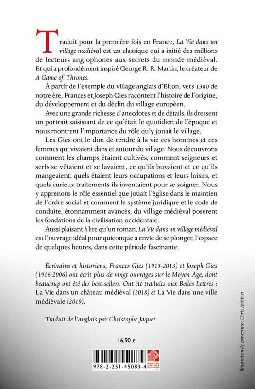 Traduit pour la premiere fois en France, La Vie dans un village medieval est un classique qui a initie des millions de lecteurs anglophones aux secrets du monde medieval. Et qui a profondement inspire George R. R. Martin, le createur de A Game of Thrones. A partir de l'exemple du village anglais d'Elton, vers 1300 de notre ere, Frances et Joseph Gies racontent l'histoire de l'origine, du developpement et du declin du village europeen. Avec une grande richesse d'anecdotes et de details, ils dressent un portrait saisissant de ce qu'etait le quotidien de l'epoque et nous montrent l'importance du role qu'y jouait le village. Les Gies ont le don de rendre a la vie ces hommes et ces femmes qui vivaient dans et autour du village. Nous decouvrons comment les champs etaient cultives, comment seigneurs et serfs se vetaient et se lavaient, ce qu'ils buvaient et ce qu'ils mangeaient, quels etaient leurs occupations et leurs loisirs, et quels curieux traitements ils inventaient pour se soigner. Nous y apprenons le role essentiel que jouait l'eglise dans le maintien de l'ordre social et comment le systeme juridique et le code de conduite, etonnamment avances, du village medieval poserent les fondations de la civilisation occidentale. Aussi plaisant a lire qu'un roman, La Vie dans un village medieval est l'ouvrage ideal pour quiconque a envie de se plonger, l'espace de quelques heures, dans cette periode fascinante.