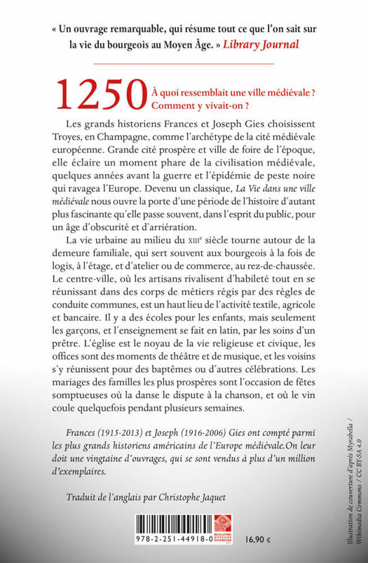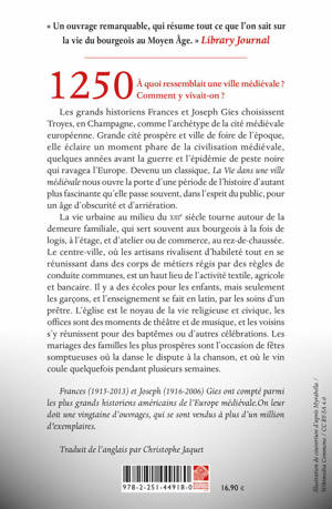 Les grands historiens Frances et Joseph Gies choisissent Troyes, en Champagne, comme l'archetype de la cite medievale europeenne. Grande cite prospere et ville de foire de l'epoque, elle eclaire un moment phare de la civilisation medievale, quelques annees avant la guerre et l'epidemie de peste noire qui ravagea l'Europe. Devenu un classique, La Vie dans une ville medievale nous ouvre la porte d'une periode de l'histoire d'autant plus fascinante qu'elle passe souvent, dans l'esprit du public, pour un age d'obscurite et d'arrieration. La vie urbaine au milieu du XIIIe siecle tourne autour de la demeure familiale, qui sert souvent aux bourgeois a la fois de logis, a l'etage, et d'atelier ou de commerce, au rez-de-chaussee. Le centre-ville, ou les artisans rivalisent d'habilete tout en se reunissant dans des corps de metiers regis par des regles de conduite communes, est un haut lieu de l'activite textile, agricole et bancaire. Il y a des ecoles pour les enfants, mais seulement les garcons, et l'enseignement se fait en latin, par les soins d'un pretre. L'eglise est le noyau de la vie religieuse et civique, les offices sont des moments de theatre et de musique, et les voisins s'y reunissent pour des baptemes ou d'autres celebrations. Les mariages des familles les plus prosperes sont l'occasion de fetes somptueuses ou la danse le dispute a la chanson, et ou le vin coule quelquefois pendant plusieurs semaines.
