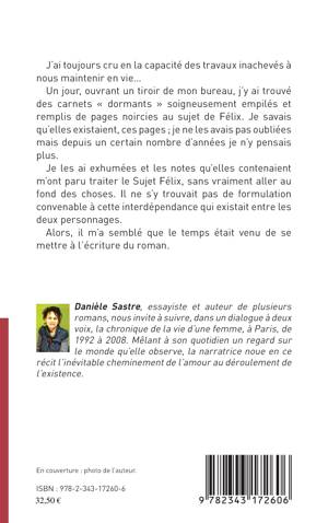 J'ai toujours cru en la capacité des travaux inachevés à nous maintenir en vie Un jour, ouvrant un tiroir de mon bureau, j'y ai trouvé des carnets « dormants » soigneusement empilés et remplis de pages noircies au sujet de Félix. Je les ai exhumées et les notes qu'elles contenaient m'ont paru traiter le Sujet Félix, sans vraiment aller au fond des choses. Alors, il m'a semblé que le temps était venu de se mettre à l'écriture du roman.
