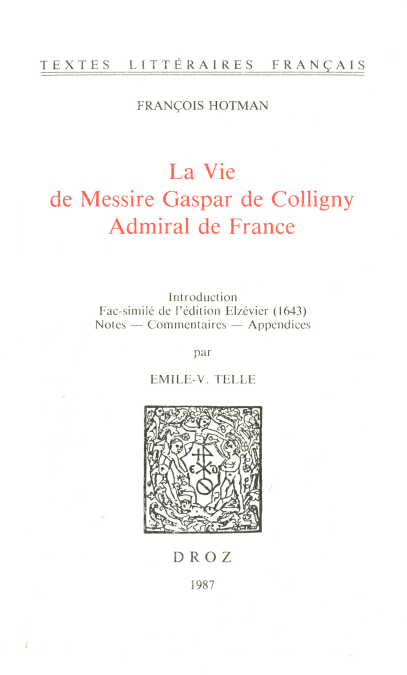 La biographie de Coligny par François Hotman est un texte de 1575 presque totalement inconnu, parce qu'écrit en latin. Emile V. Telle, qui reproduit ici la version française anonyme des environs de 1600, nous la révèle comme une oeuvre d'une extraordinaire valeur documentaire et d'une exceptionnelle qualité biographique et littéraire, saisissant pour la première fois dans son ampleur la pensée religieuse de Coligny, la psychologie du soldat et le rôle éminent qu'il a joué dans le mouvement huguenot. L'introduction situe le texte de Hotman dans le contexte des guerres de religion. Un très riche appareil de notes agrémentées de nombreuses citations de Brantôme et d'autres chroniqueurs, forme un commentaire savoureux cuisiné "aux petits oignons et épicé d'une pointe d'ail".