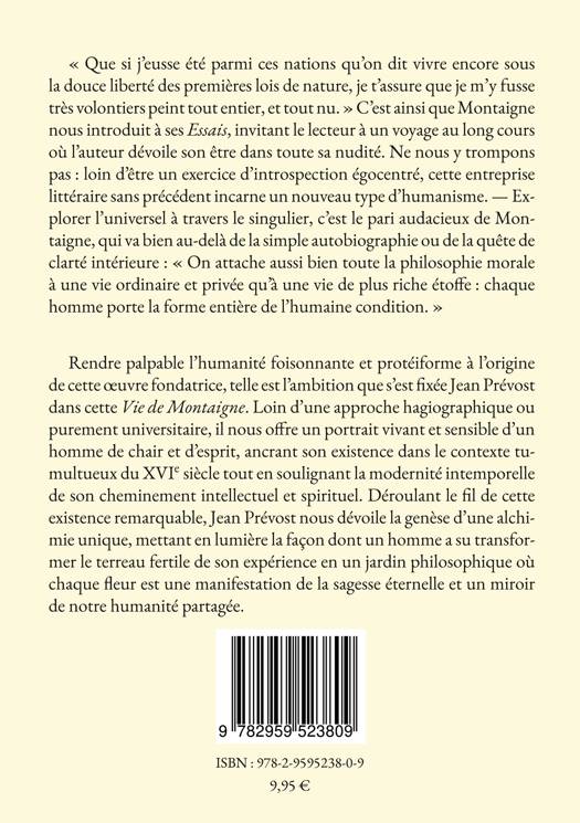 « Que si j'eusse été parmi ces nations qu'on dit vivre encore sous la douce liberté des premières lois de nature, je t'assure que je m'y fusse très volontiers peint tout entier, et tout nu. » C'est ainsi que Montaigne nous introduit à ses Essais, invitant le lecteur à un voyage au long cours où l'auteur dévoile son être dans toute sa nudité. Ne nous y trompons pas : loin d'être un exercice d'introspection égocentré, cette entreprise littéraire sans précédent incarne un nouveau type d'humanisme. - Explorer l'universel à travers le singulier, c'est le pari audacieux de Montaigne, qui va bien au-delà de la simple autobiographie ou de la quête de clarté intérieure : « On attache aussi bien toute la philosophie morale à une vie ordinaire et privée qu'à une vie de plus riche étoffe : chaque homme porte la forme entière de l'humaine condition. » Rendre palpable l'humanité foisonnante et protéiforme à l'origine de cette oeuvre fondatrice, telle est l'ambition que s'est fixée Jean Prévost dans cette Vie de Montaigne. Loin d'une approche hagiographique ou purement universitaire, il nous offre un portrait vivant et sensible d'un homme de chair et d'esprit, ancrant son existence dans le contexte tumultueux du XVIe siècle tout en soulignant la modernité intemporelle de son cheminement intellectuel et spirituel. Déroulant le fil de cette existence remarquable, Jean Prévost nous dévoile la genèse d'une alchimie unique, mettant en lumière la façon dont un homme a su transformer le terreau fertile de son expérience en un jardin philosophique où chaque fleur est une manifestation de la sagesse éternelle et un miroir de notre humanité partagée.