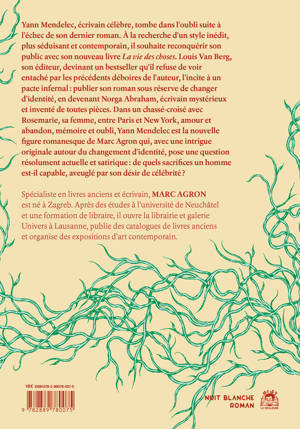 Yann Mendelec, écrivain célèbre, tombe dans l’oubli suite à l’échec de son dernier roman. À la recherche d’un style inédit, plus séduisant et contemporain, il souhaite reconquérir son public avec son nouveau livre «La vie des choses». Louis Van Berg, son éditeur, devinant un bestseller qu’il refuse de voir entaché par les précédents déboires de l’auteur, l’incite à un pacte infernal: publier son roman sous réserve de changer d’identité, en devenant Norga Abraham, écrivain mystérieux et inventé de toutes pièces. Dans un chassé-croisé avec Rosemarie, sa femme, entre Paris et New York, amour et abandon, mémoire et oubli, Yann Mendelec est la nouvelle figure romanesque de Marc Agron qui, avec une intrigue originale autour du changement d’identité, pose une question Ârésolument actuelle et satirique: de quels sacrifices un homme est-il capable, aveuglé par son désir de célébrité?