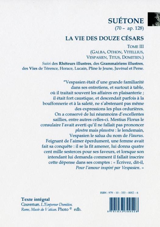 Ce volume comprend les vies de : Galba, Othon, Vitellius, Vespasien, Titus, Domitien. Celles des grammairiens et des rhéteurs illustres. Ainsi que les biographies de Terence, Horace, Lucain, Pline, Juvénal et Perse.