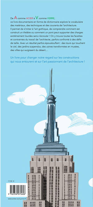 Comment fonctionne un ascenseur ? Depuis quand les immeubles ont-ils des balcons ? Combien de temps fallait-il pour construire un château fort ? Qu'est-ce qu'une maison écologique ? De A comme Acier à V comme Verre, ce petit dictionnaire initiera le lecteur aux bases de l'architecture, à son histoire, tout en mettant en lumière le travail des plus grands architectes contemporains.