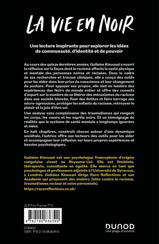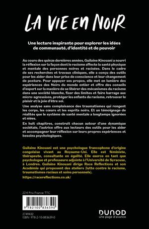 Au cours des quinze dernières années, Guilaine Kinouani a nourri la réflexion sur la façon dont le racisme affecte la santé physique et mentale des personnes noires et racisées. Dans le cadre de ses recherches et travaux cliniques, elle a conçu des outils pour les aider dans leur prise de conscience et leur changement de posture. Pour appuyer ses propos, elle met en lumière des expériences des Noirs du monde entier et offre des conseils d’expert sur la manière de se libérer des mécanismes du racisme dans une société blanche, fixer des limites et faire barrage aux micro-agressions, protéger les enfants du racisme, retrouver le plaisir et la joie d’être soi. Une analyse sans complaisance des traumatismes qui rongent les corps, les cœurs et les esprits noirs. Et un témoignage de réalités que le système de santé mentale a longtemps ignorées et niées. En huit chapitres, construit chacun autour d’une dynamique sociétale, l’autrice offre aux lecteurs des outils pour les aider et accompagner leur réflexion sur leurs propres expériences et besoins psychologiques.