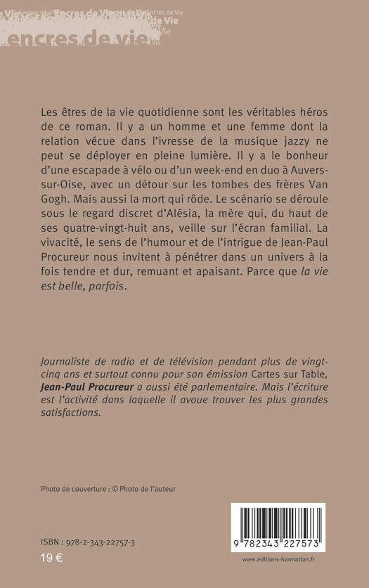 Les êtres de la vie quotidienne sont les véritables héros de ce roman. Il y a un homme et une femme dont la relation vécue dans l'ivresse de la musique jazzy ne peut se déployer en pleine lumière. Il y a le bonheur d'une escapade à vélo ou d'un week-end en duo à Auvers-sur-Oise, avec un détour sur les tombes des frères Van Gogh. Mais aussi la mort qui rôde. Le scénario se déroule sous le regard discret d'Alésia, la mère qui, du haut de ses quatre-vingt-huit ans, veille sur l'écran familial. La vivacité, le sens de l'humour et de l'intrigue de Jean-Paul Procureur nous invitent à pénétrer dans un univers à la fois tendre et dur, remuant et apaisant. Parce que la vie est belle, parfois.