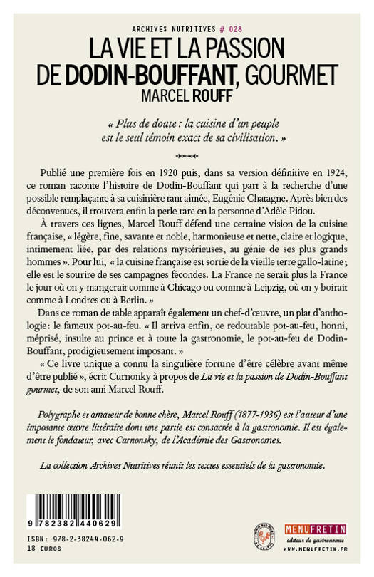 Publié une première fois en 1920 puis, dans sa version définitive en 1924, ce roman raconte l’histoire de Dodin-Bouffant qui part à la recherche d’une possible remplaçante à sa cuisinière tant aimée, Eugénie Chatagne. Après bien des déconvenues, il trouvera enfin la perle rare en la personne d’Adèle Pidou. À travers ces lignes, Marcel Rouff défend une certaine vision de la cuisine française, « légère, fine, savante et noble, harmonieuse et nette, claire et logique, intimement liée, par des relations mystérieuses, au génie de ses plus grands hommes ». Pour lui, « la cuisine française est sortie de la vieille terre gallo-latine ; elle est le sourire de ses campagnes fécondes. La France ne serait plus la France le jour où on y mangerait comme à Chicago ou comme à Leipzig, où on y boirait comme à Londres ou à Berlin. » Dans ce roman de table apparaît également un chef-d’œuvre, un plat d’anthologie : le fameux pot-au-feu. « Il arriva enfin, ce redoutable pot-au-feu, honni, méprisé, insulte au prince et à toute la gastronomie, le pot-au-feu de Dodin-Bouffant, prodigieusement imposant. » « Ce livre unique a connu la singulière fortune d’être célèbre avant même d’être publié », écrit Curnonky à propos de La vie et la passion de Dodin-Bouffant gourmet, de son ami Marcel Rouff.