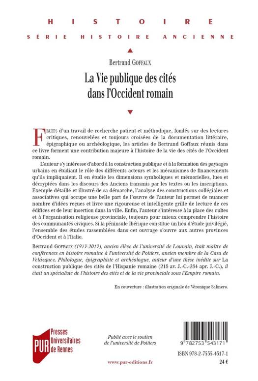 Fruits d’un travail de recherche patient et méthodique, fondés sur des lectures critiques, renouvelées et toujours croisées de la documentation littéraire, épigraphique ou archéologique, les articles de Bertrand Goffaux réunis dans ce livre forment une contribution majeure à l’histoire de la vie des cités de l’Occident romain.