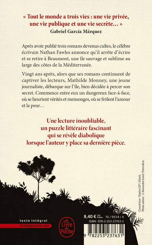 Vingt ans après, alors que ses romans continuent de captiver les lecteurs, Mathilde Monney, une jeune journaliste, débarque sur l'île, bien décidée à percer son secret. Commence entre eux un dangereux face-à-face, où se heurtent vérités et mensonges, où se frôlent l'amour et la peur...