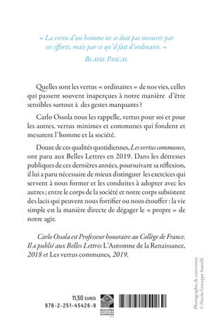 Quelles sont les vertus ordinaires de nos vies, celles qui passent souvent inapercues a notre maniere d'etre sensibles surtout a des gestes marquants ? Carlo Ossola nous les rappelle, vertus pour soi et pour les autres, vertus minimes et communes qui fondent et mesurent l'homme et la societe. Douze de ces qualites quotidiennes, Les vertus communes, ont paru aux Belles Lettres en 2019. Dans les detresses publiques de ces dernieres annees, poursuivant sa reflexion, il lui a paru necessaire de mieux distinguer les exercices qui servent a nous former et les conduites a adopter avec les autres; entre le corps de la societe et notre corps subsistent des lacis qui peuvent nous fortifier ou nous etouffer: la vie simple est la maniere directe de degager le propre de notre agir.