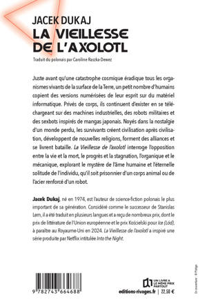 Juste avant qu'une catastrophe cosmique éradique tous les organismes vivants de la surface de la Terre, un petit nombre d'humains copient des versions numérisées de leur esprit sur du matériel informatique. Privés de corps, ils continuent d'exister en se téléchargeant sur des machines industrielles, des robots militaires et des sexbots inspirés de mangas japonais. Noyés dans la nostalgie d'un monde perdu, les survivants créent civilisation après civilisation, développent de nouvelles religions, forment des alliances et se livrent bataille. La Vieillesse de l'axolotl interroge l'opposition entre la vie et la mort, le progrès et la stagnation, l'organique et le mécanique, explorant le mystère de l'âme humaine et l'éternelle solitude de l'individu, qu'il soit prisonnier d'un corps animal ou de l'acier renforcé d'un robot.